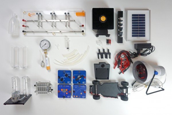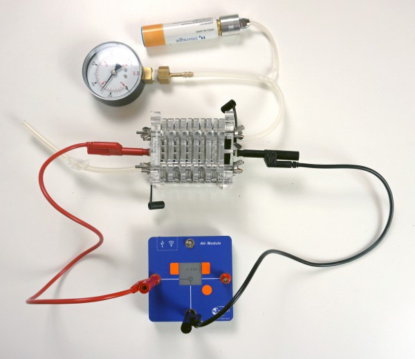 Wir setzen außerdem eine neue Version der Brennstoffzelle ein. Der Brennstoffzellen Stack besteht aus fünf Einzelzellen und kann durch die Studenten komplett in seine Einzelteile zerlegt werden. Es ist auf diese Weise möglich Experimente sowohl mit dem gesamten Stack als auch mit der Einzelzelle durchzuführen. Der Brennstoffzellen Stack kann entweder mit dem Elektrolyseur oder mit dem H2 Storage Modul betrieben werden. Des Weiteren enthalten ist der Winderzeuger, um den Kamineffekt bzw. den Wasserstoffbedarf einer Brennstoffzelle zu untersuchen. Schließlich bieten wir noch ein neues Automodel, zur Demonstration eines Brennstoffzellen angetriebenen Fahrzeugs.